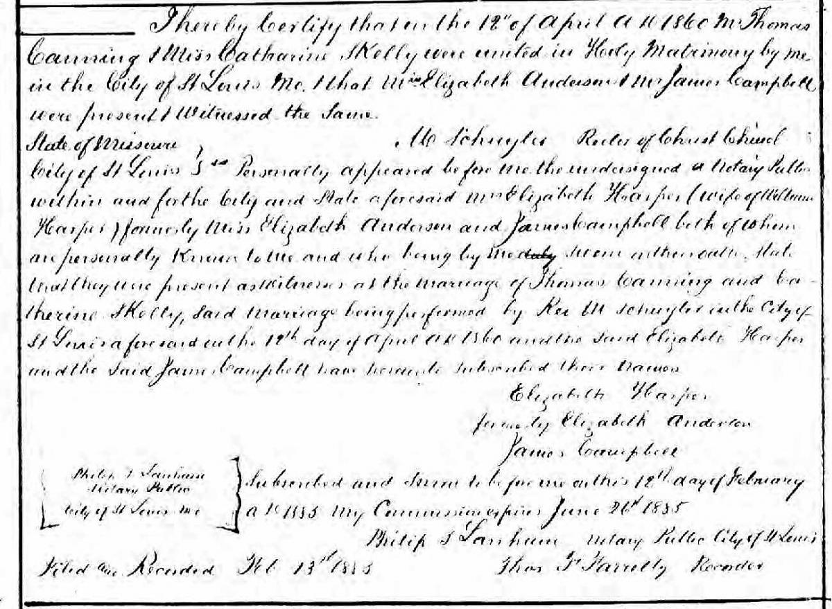 Thomas and Catherine immigrated to the U.S. and arrived in Texas County in 1853. They married April 12, 1860, in St. Louis, according to a marriage certificate on file. However, conflicting dates recorded in the St. Louis marriage archives list Thomas’ marriage date as April 21, 1860, and Catharine’s as April 12, 1860.