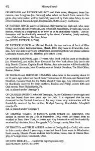 An Irish immigrant advertisement placed under Missing Friends, in the December 24, 1859, edition of the The Boston Pilot under “Armagh” inquired, “Of Thomas and Bernard Canning, who came to this country about 10 or 11 years ago; when last heard from Thomas was in St. Louis, and Bernard left Stratford, Canada West, for the States about three years ago. Any information will be thankfully received by their brothers, Francis and Philip, corner 40th and Oak streets, West Philadelphia, Pa.” (One reference to Armagh is that it is the county town of County Armagh, and a city in Northern Ireland, as well as a civil parish. It is the ecclesiastical capital of Ireland.)