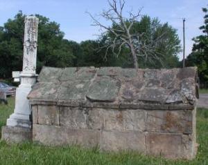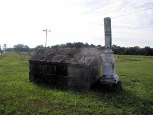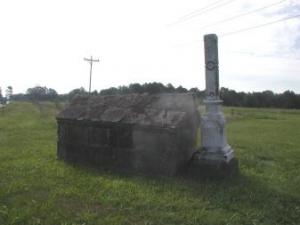 The deteriorating Canning tomb where Ozark pioneer Thomas M. Canning is interred. Note the beautiful white marble dove that sits atop the eight-foot monument.