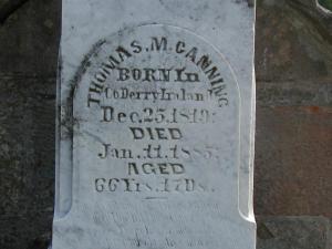 Thomas M. Canning, was born December 25, 1819, in County Derry, Ireland, and “died instant” on January 11, 1885, aged 66 years, 17 days.
