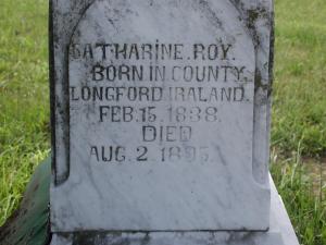 Catherine Skelly Roy, was born February 15, 1838, in County Longford, Ireland, and was deceased August 2, 1895. After the passing of Thomas, she remarried prior to 1888, to Mr. John Kaighan, and remarried a second time to her third husband, a prominent resident of Licking, Mr. William Roy. Roy buried her next to her first husband, Thomas.