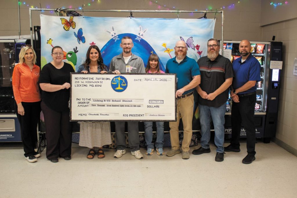 The Restorative Justice Organization (RJO) at South Central Correctional Center (SCCC) raised $3,787.22 to assist in covering school lunch debt in the Licking R-8 School District. Representatives from the school were presented the check on Tuesday, April 14. From left are Telena Haneline, Licking R-8 Superintendent; Amber Goodson, Director of Nutrition Services; Samie Lewis, Food Service Director; Resident Joshua Moore, President of RJO; Cindy Roach, RJO Program Coordinator; Warden Michael Shewmaker; Deputy Warden Derek Dawson and Deputy Warden Heath Cantrell. Representatives of the district expressed their gratitude for the generous contribution.